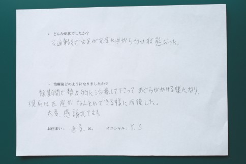 短期間で勢力的に治療してくださって、あぐらがかける様になり、現在は正座がなんとかできる様に回復した。