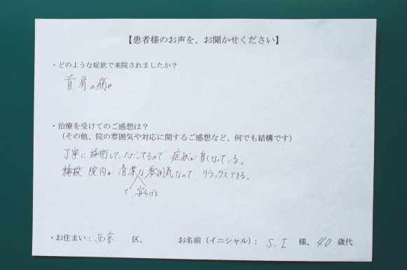 デスクワークの多い私は、肩から背中、腰にかけて鉄のように固く凝るのですが、先生の施術を受けた後には、うそのように軽くなります。